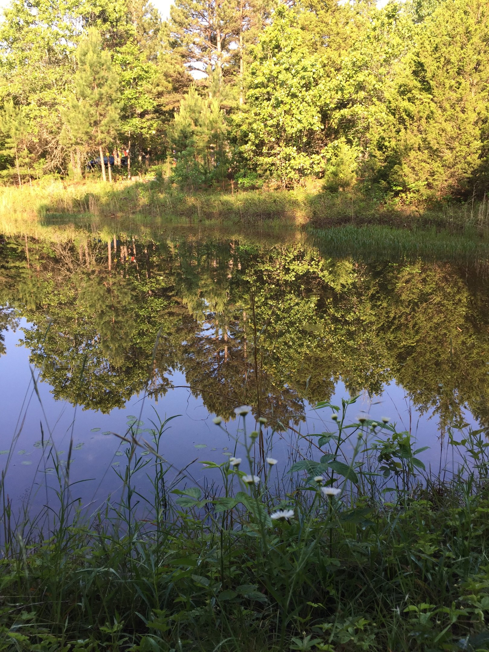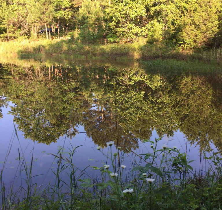 A picture of the pond and tree reflections at Life Healing Community in springtime.